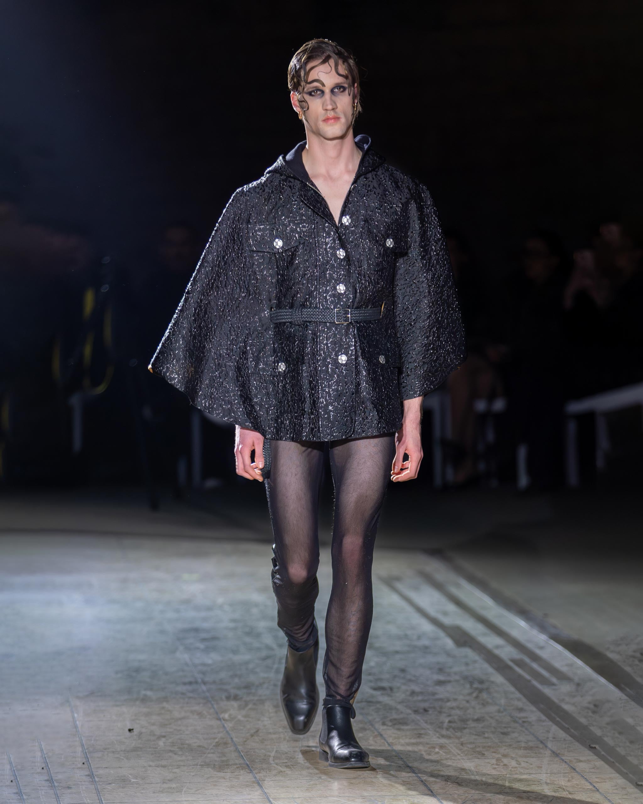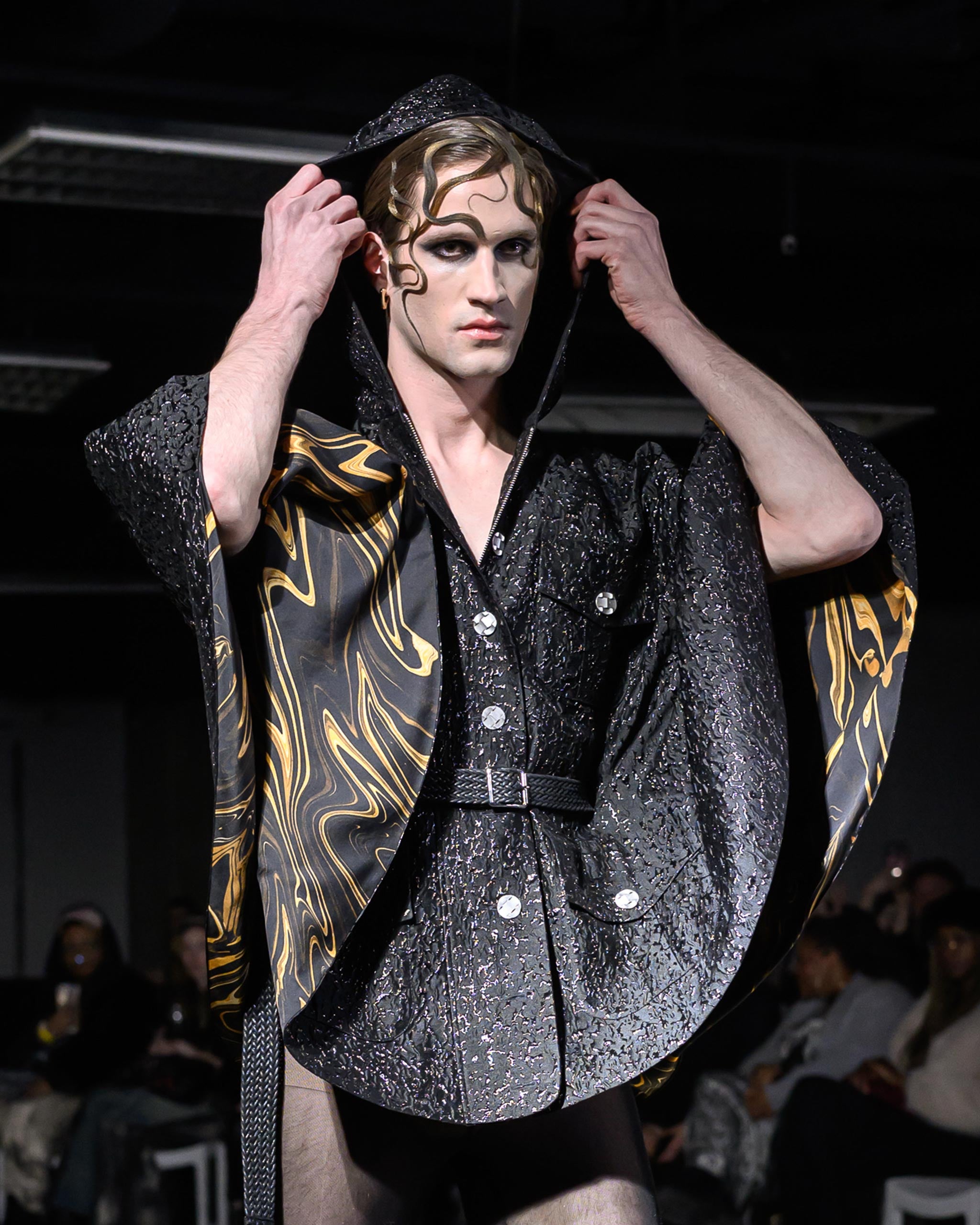 Step into the vortex of Berlin street style luxury with the OATH hooded cape coat. A definitive piece of outerwear armor from our FW26 London Fashion Week collection, this unisex cape features an exclusive high-relief bubbled texture that mimics the resilience of urban landscapes. The design is engineered for dramatic volume, featuring a protective integrated hood and two rows of hand-polished silver MYL buttons that provide a powerful, industrial shield. The integrated braided belt allows the wearer to customize the stance, while the abstract contrast lining reflects the journey of self-discovery within. A true monument to uniqueness for those who command the space between the underground and the high-fashion runway.