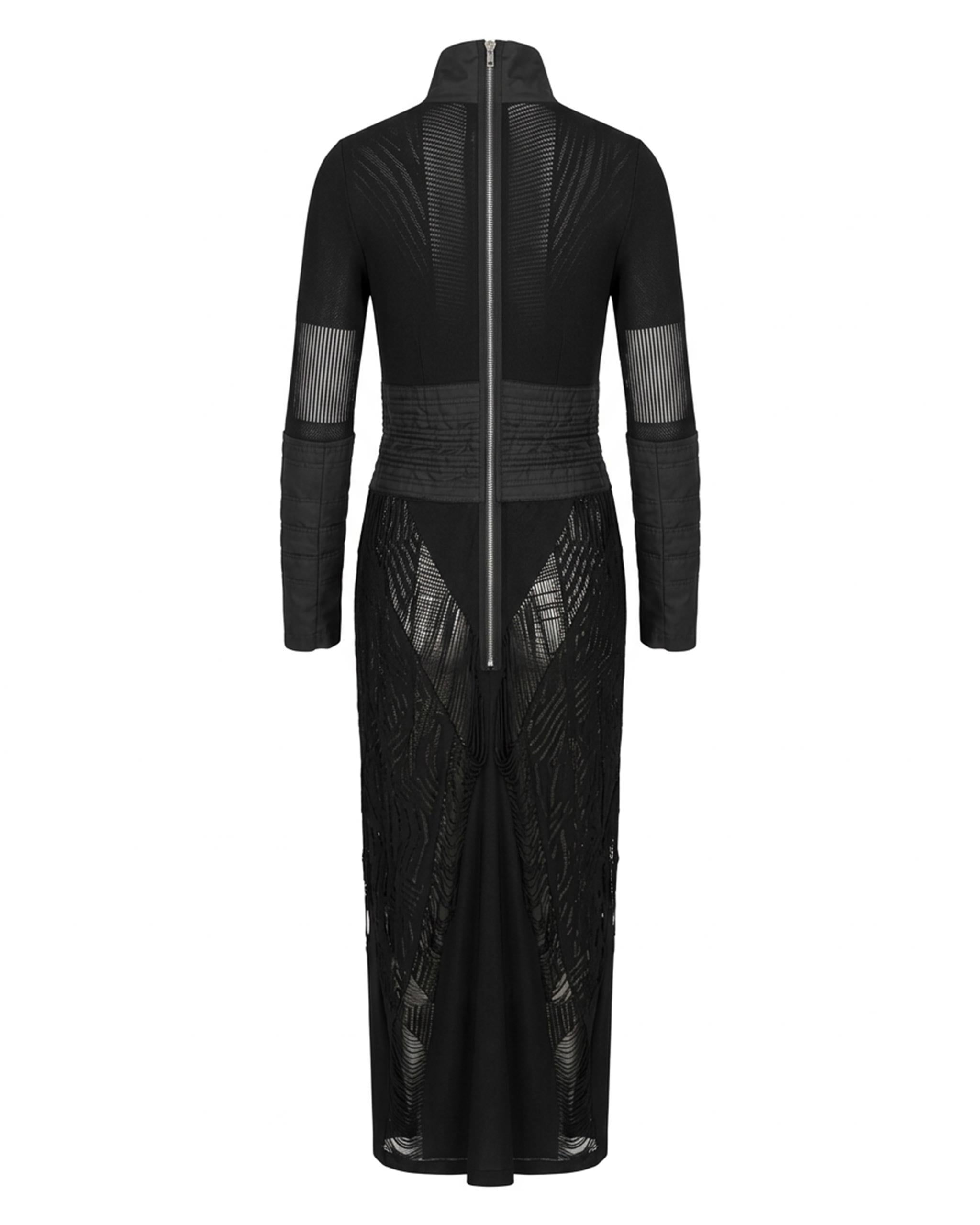 Finishings: Full-length industrial center rear zipper and deconstructed relief texture
