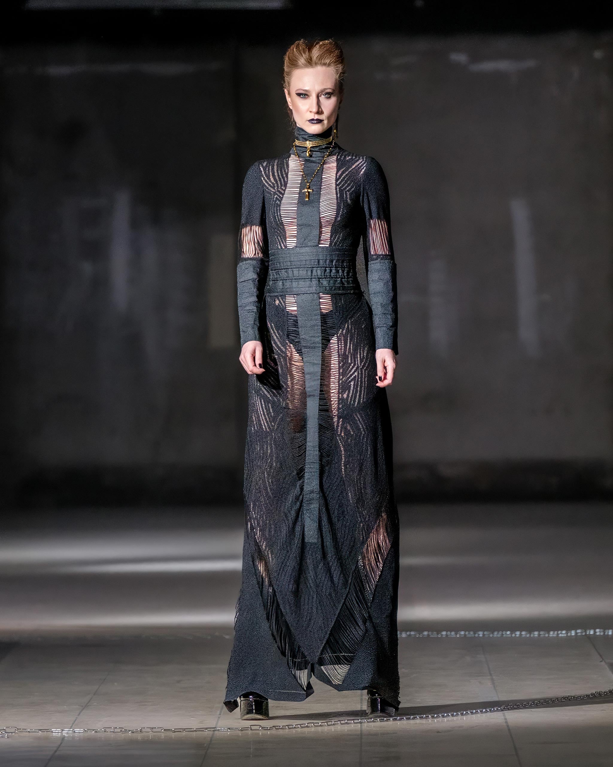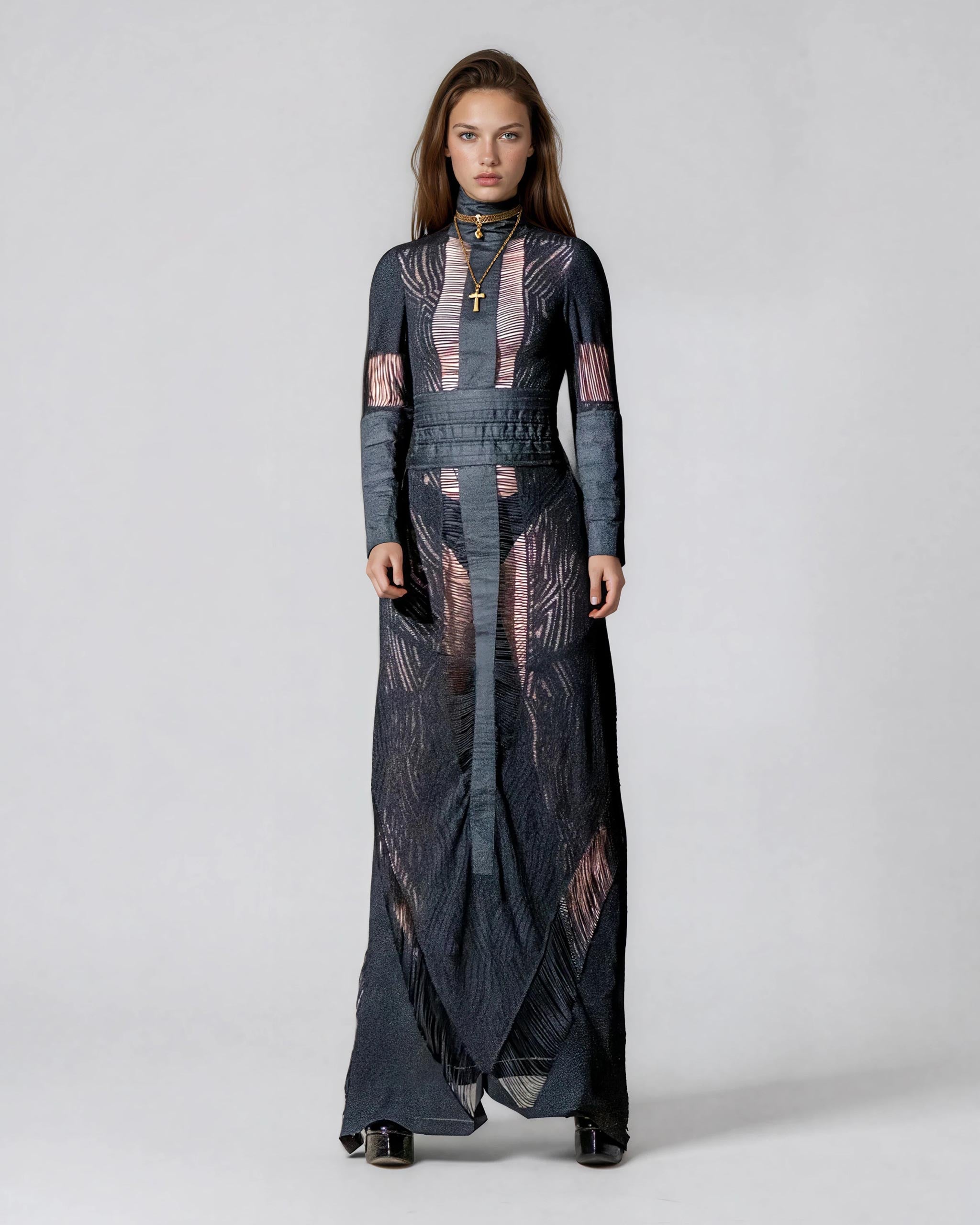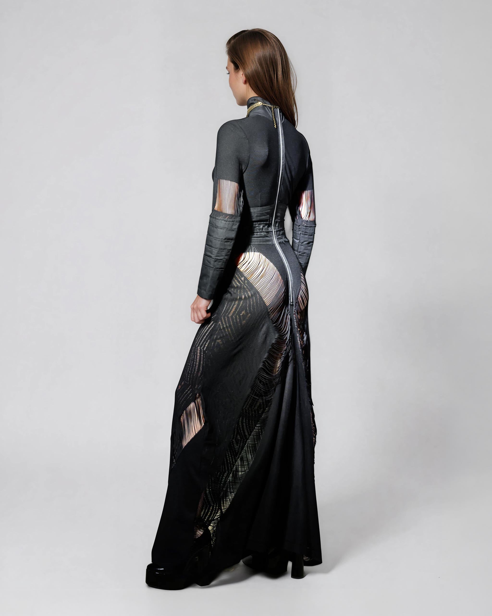 Rebuild your reality with the OATH sentinel gown. A definitive showpiece of our FW26 'The Oath' LFW collection, this unisex gown is a masterclass in industrial deconstruction and technical excellence. Cut from a premium, high-performance black fabric that mimics urban resilience, the design is defined by its architectural complexity: protective padded forearm guards and a structured, ribbed corset-waist that frames the human stance with absolute authority. The floor-length silhouette features an intricate, hand-crafted vertical relief texture through the skirt, capturing the intoxicating energy of a Berlin underground techno vortex in every line. Engineered with sustainable artisanal craftsmanship, this technical maxi dress functions as a multidimensional armor that transitions from the high-fashion runway to the dark core of the urban landscape. Designed for those who refuse to be hidden and command their space with certainty.
