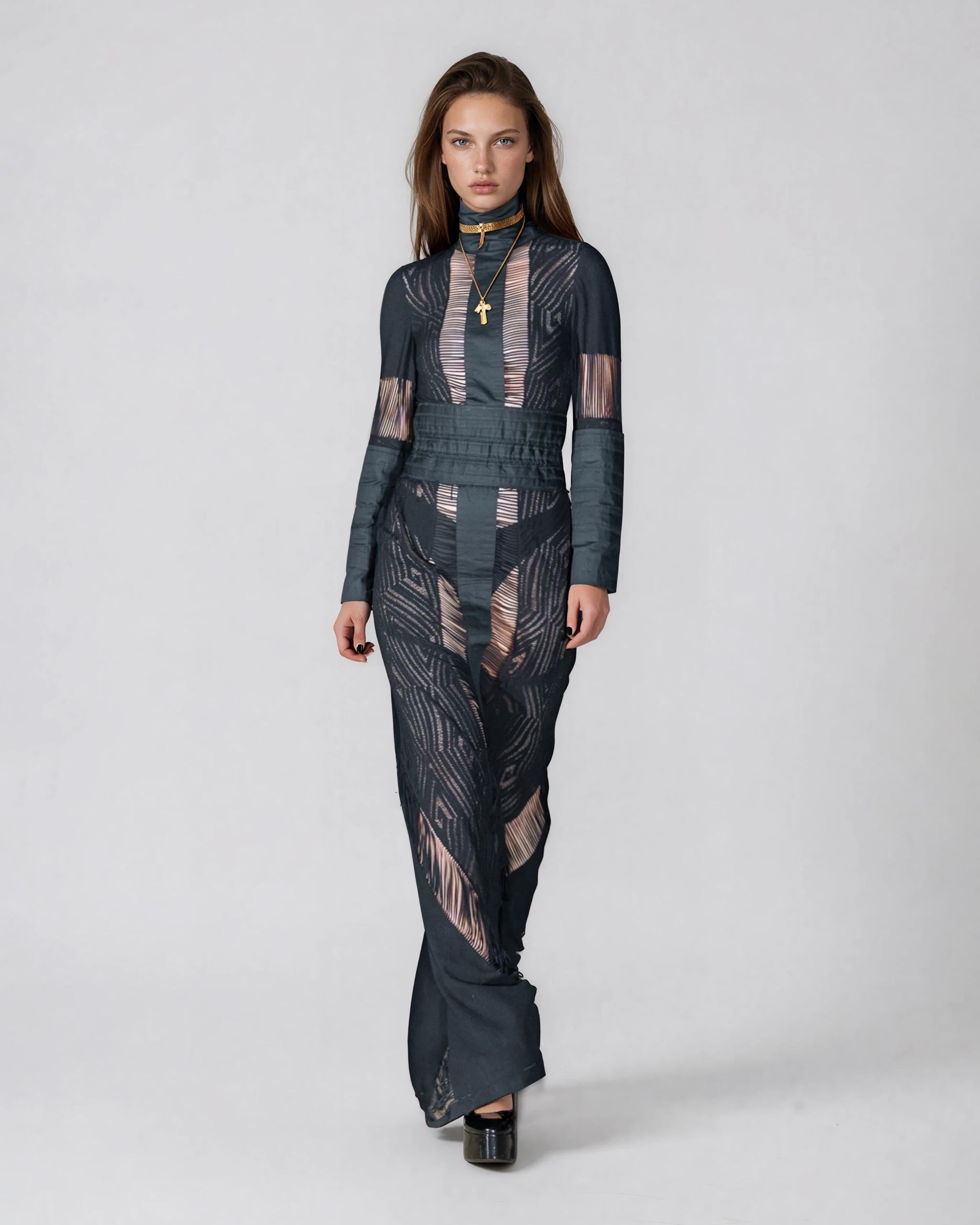 Fit: Unisex/Gender-neutral, structured second-skin fit with voluminous skirt elements.