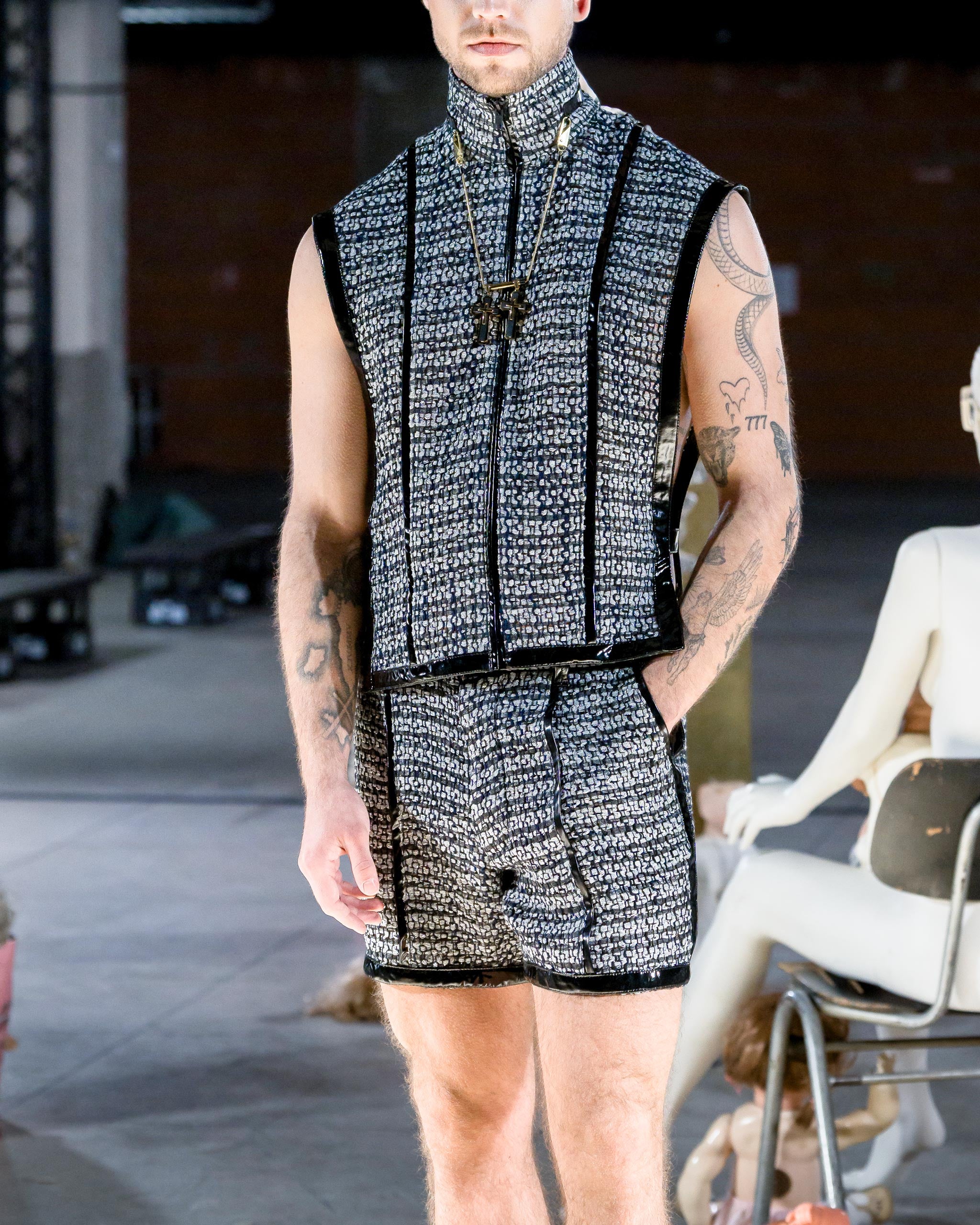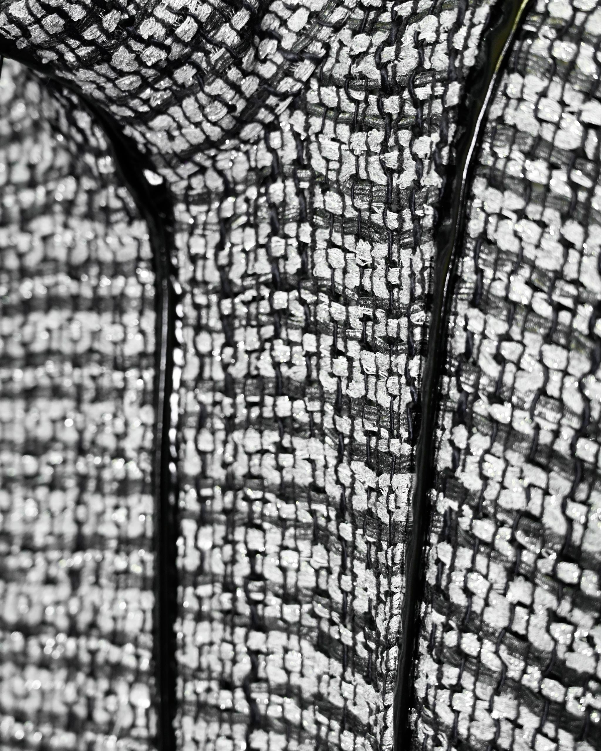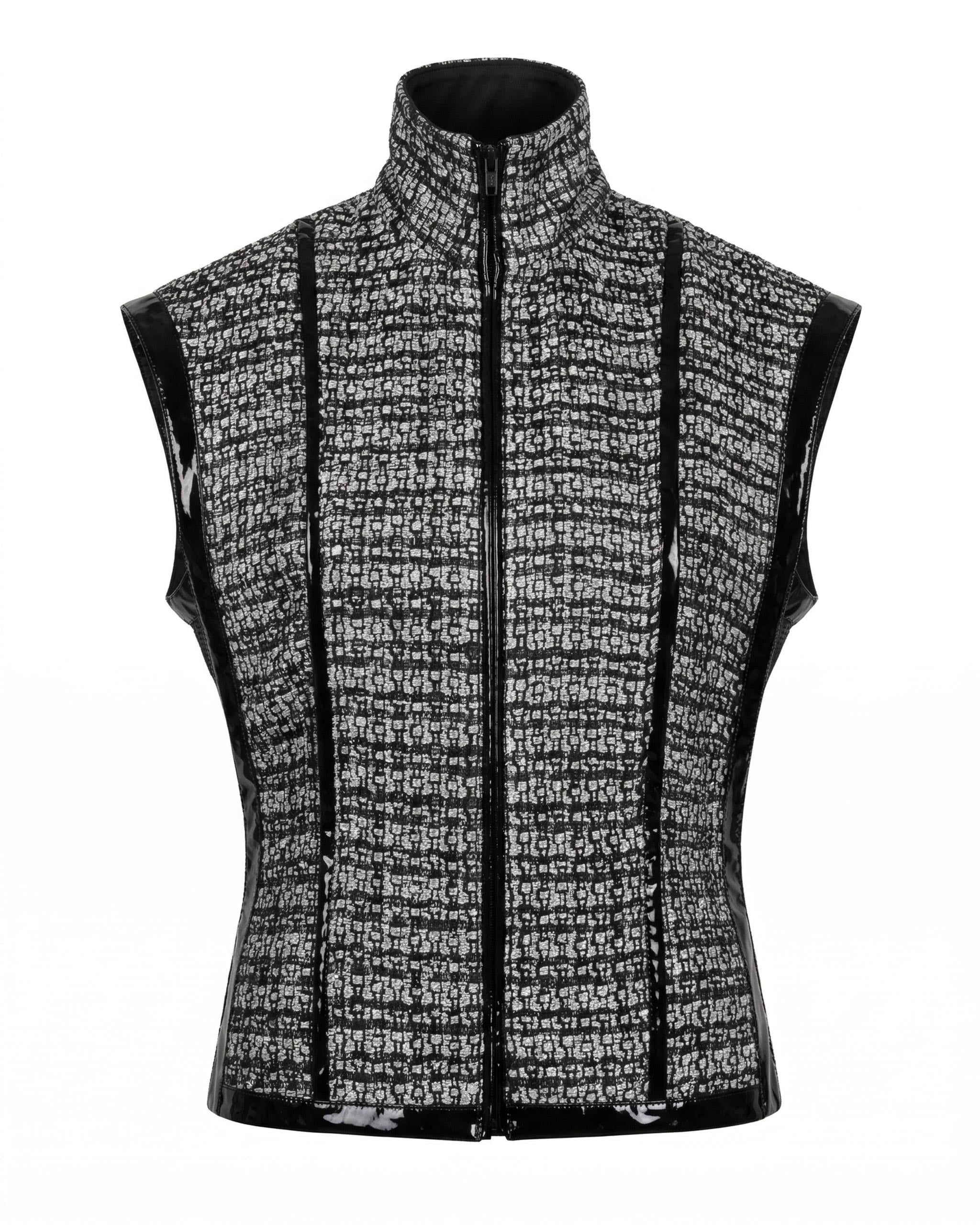 The GRID armor vest operates as a system before it operates as a garment. Its richly woven black and silver textile doesn't decorate the surface, it encodes it, fragmenting light into a controlled metallic rhythm that suggests circuitry, architecture, something engineered rather than simply made. Up close it reads as texture. At distance it reads as intention. Both readings are correct.