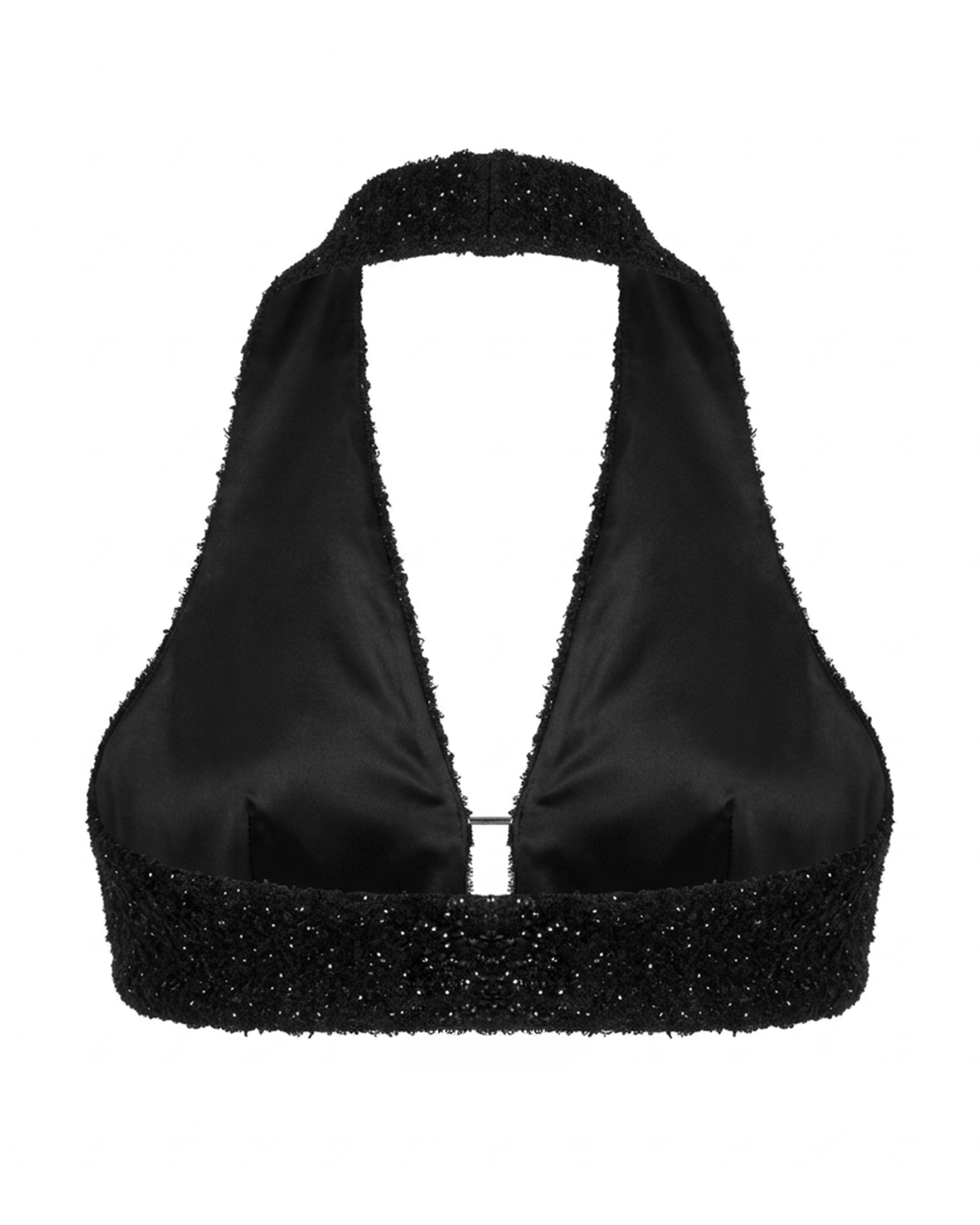 The NOCTRA halo top is a study in radical reduction, a fragment rather than a garment, a gesture rather than a construction. Its richly textured black fabric absorbs the room and gives it back differently, a surface that shifts from shadow to shimmer depending on the light, depending on who's watching, depending on how still you're willing to stand.