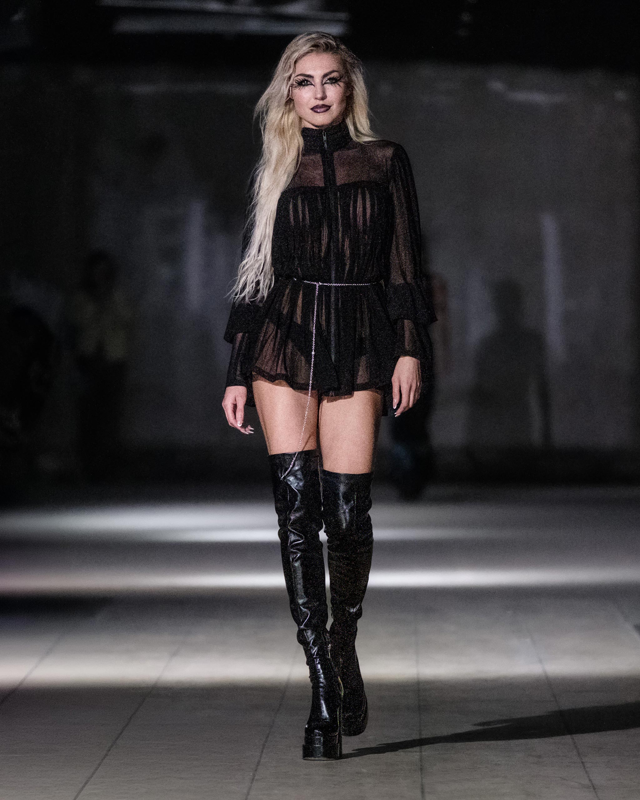 The NOIR veil corset blouse is the collection's most fluid argument, a piece that understands compression not as rigidity but as choreography. Ultra-light black mesh opens the upper body to full transparency, the silhouette visible beneath the surface without apology, the body present as both subject and structure. Then, at the torso, everything tightens into dense vertical pleating that shapes through accumulation rather than architecture, a corset logic built from movement and repetition rather than boning and resistance.