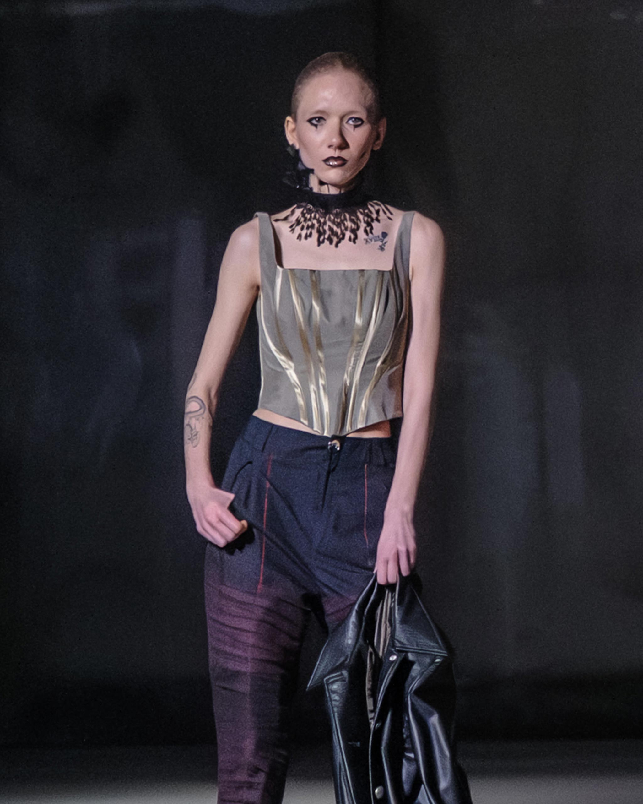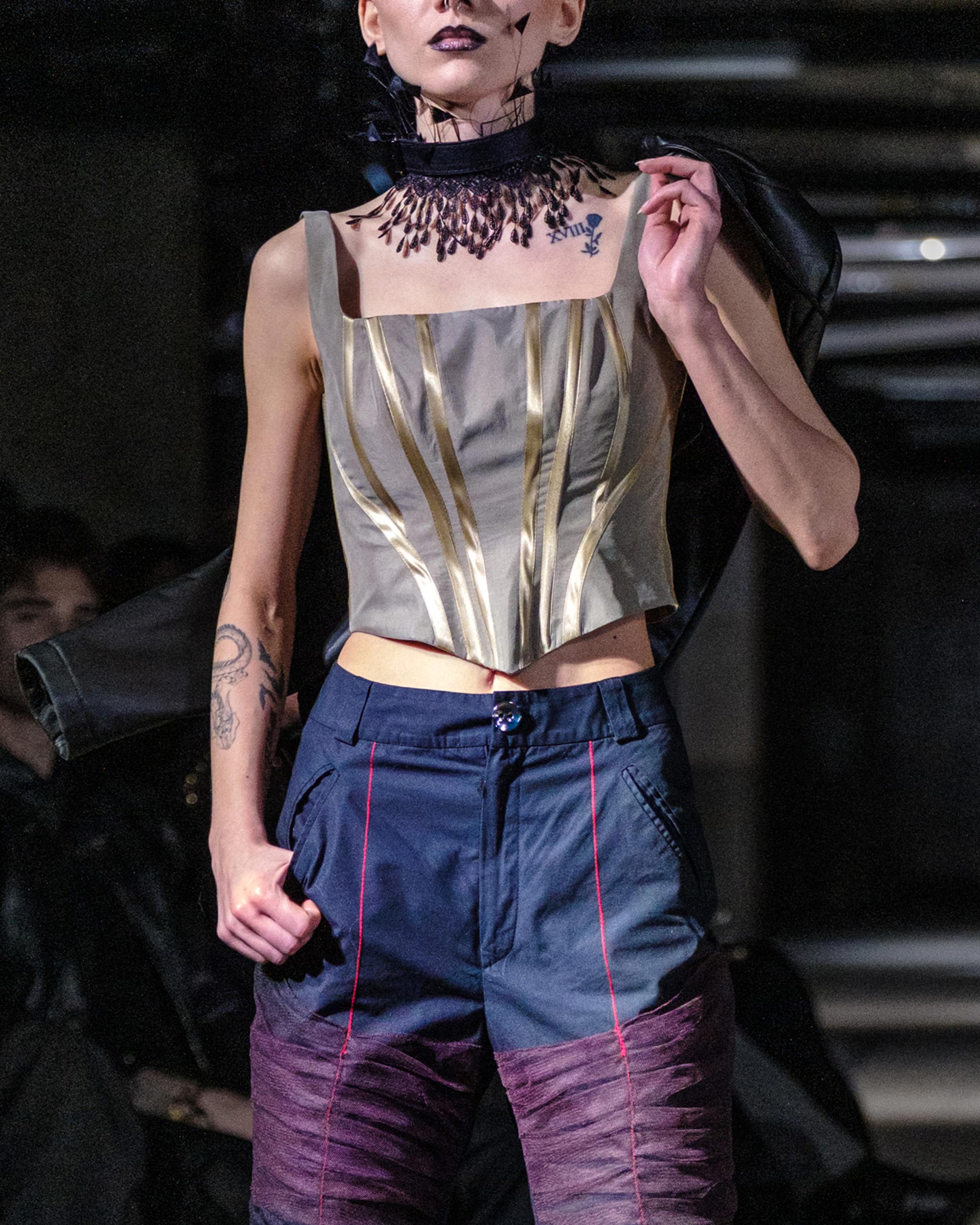 The gold appears here not as surface but as line. Vertical bands trace the body in precise symmetry, reconstructing the anatomy of traditional boning not through structure but through inscription, mapping the logic of a corset onto the body as drawn geometry rather than physical force. The waist sharpens. The torso elongates. The gold does its work quietly, which is the only way this piece would allow it.