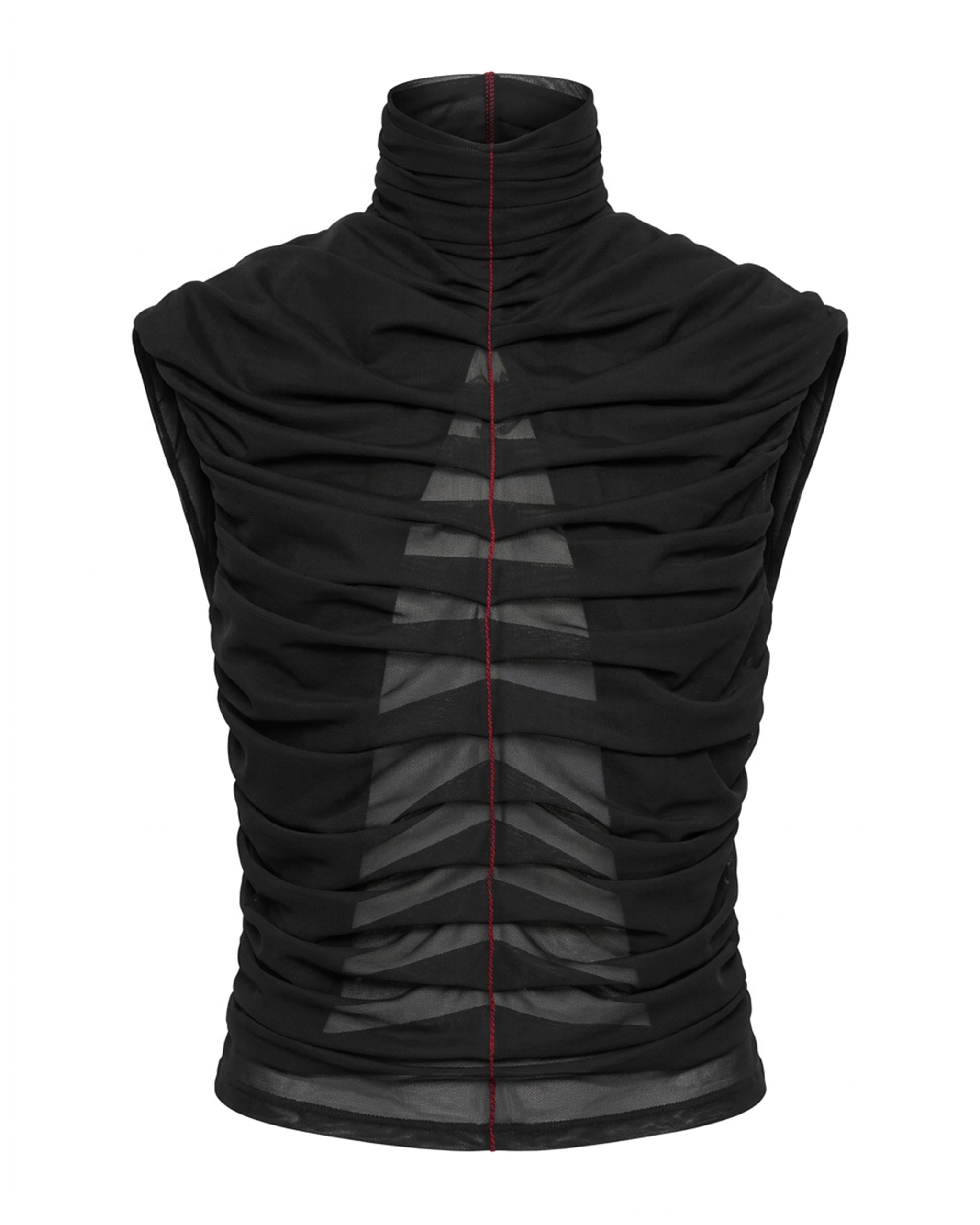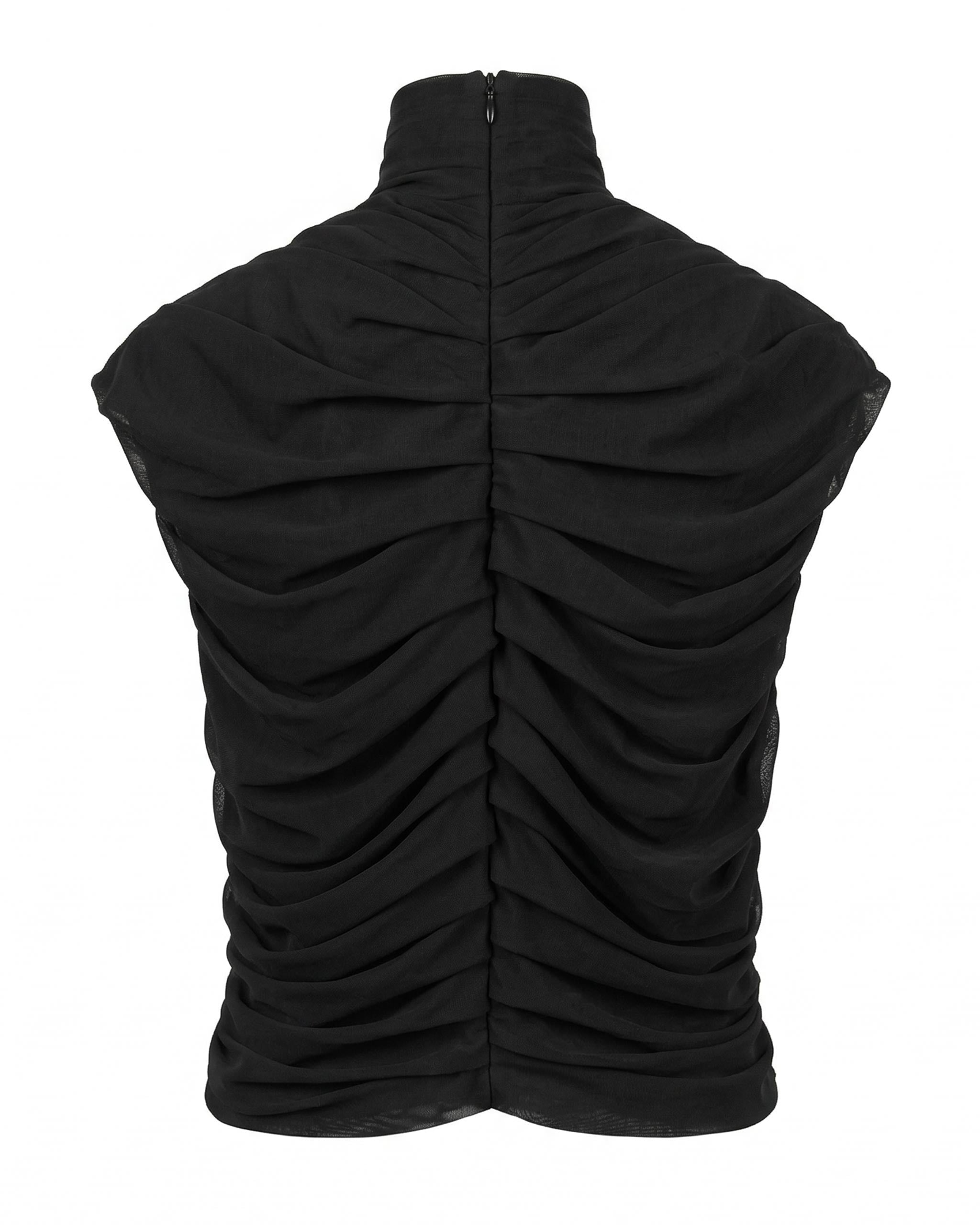 VEIL Ruched Mesh Top - Sheer black ruched sleeveless top with high neck