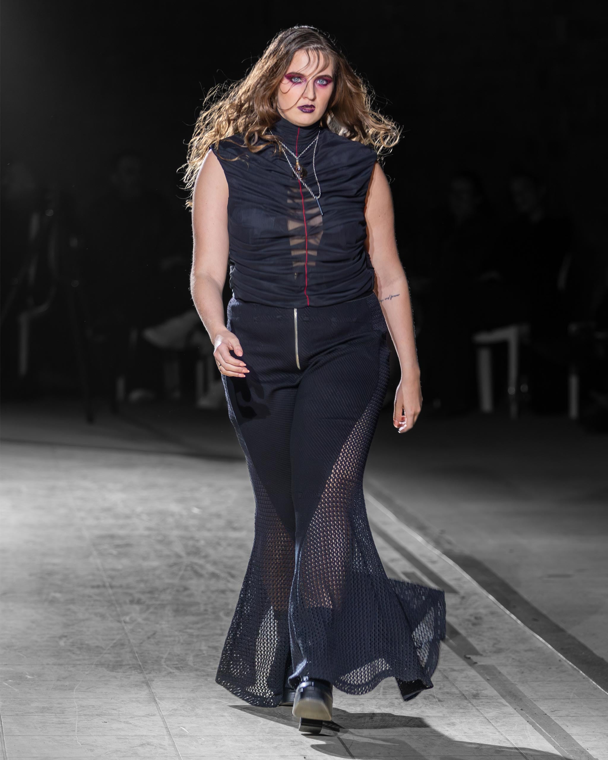 The VEIL ruched mesh top begins with transparency and works against it, layering, gathering, compressing lightweight black stretch mesh until see-through becomes structural, until fragility becomes a formal decision. The surface moves as you move, a shifting system of shadow, skin, and texture that refuses to resolve into anything fixed or final.