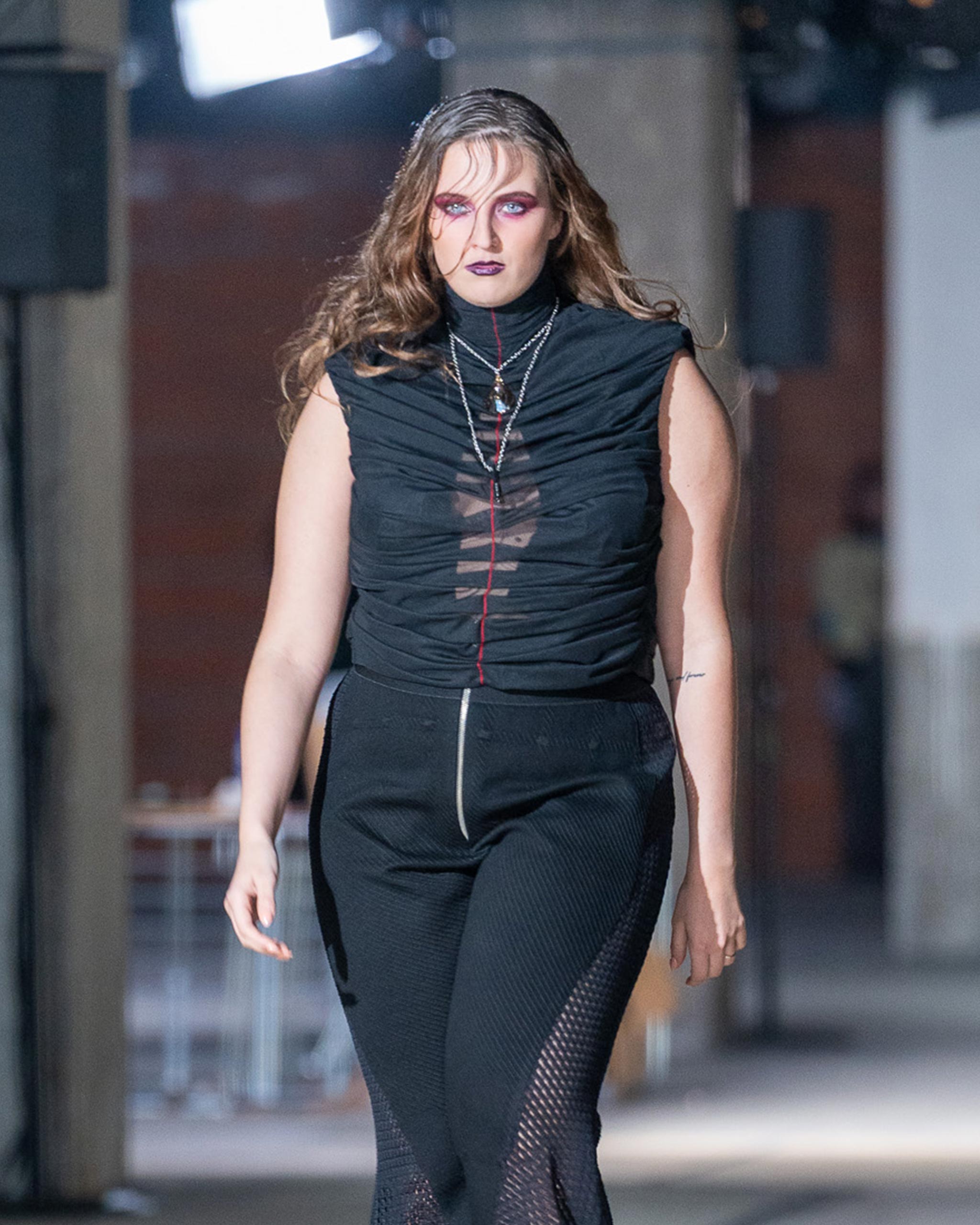 Across the torso, dense horizontal ruching pulls the fabric into dense rhythmic folds that sculpt while they conceal, reveal while they contain. The body underneath appears in fragments, between the gathered layers, through the mesh, never entirely present, never entirely absent. The tension in the construction mirrors the tension in that negotiation.