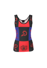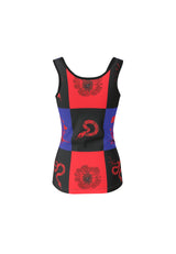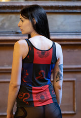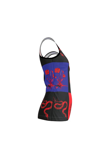 This fitted tank features our exclusive serpent-and-poppy print set against layered panels of black, red, and violet. The color blocks frame the torso, highlighting shape and stance without distraction. The silky jersey hugs close with natural stretch, offering flexibility while keeping its edge.